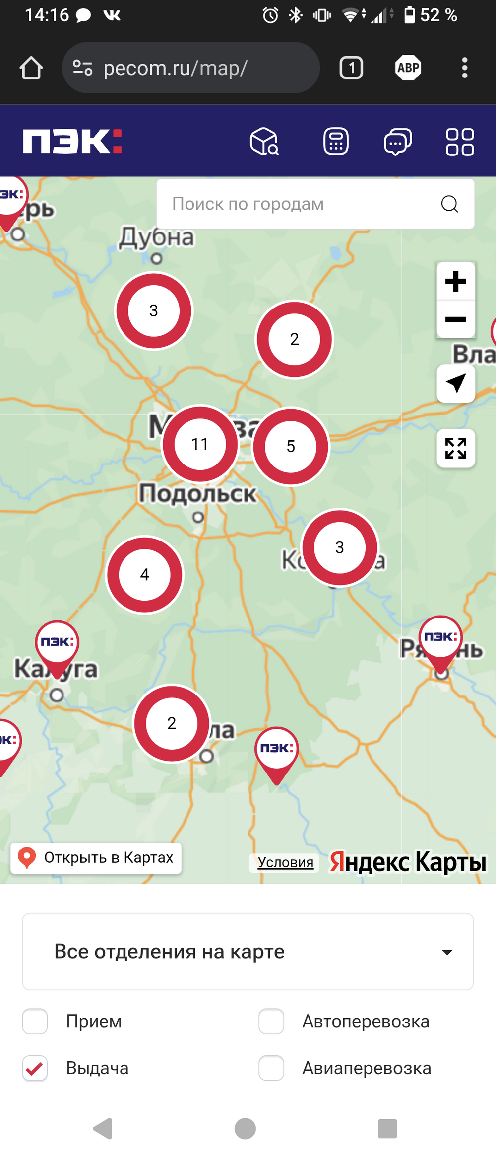 2. Доставка осуществляется до терминала ТК "ПЭК" по всей России. Что бы найти подходящий склад, вам необходимо подобрать на карте (клик) ближайшее отделение в вашем городе, выбрав фильтры: